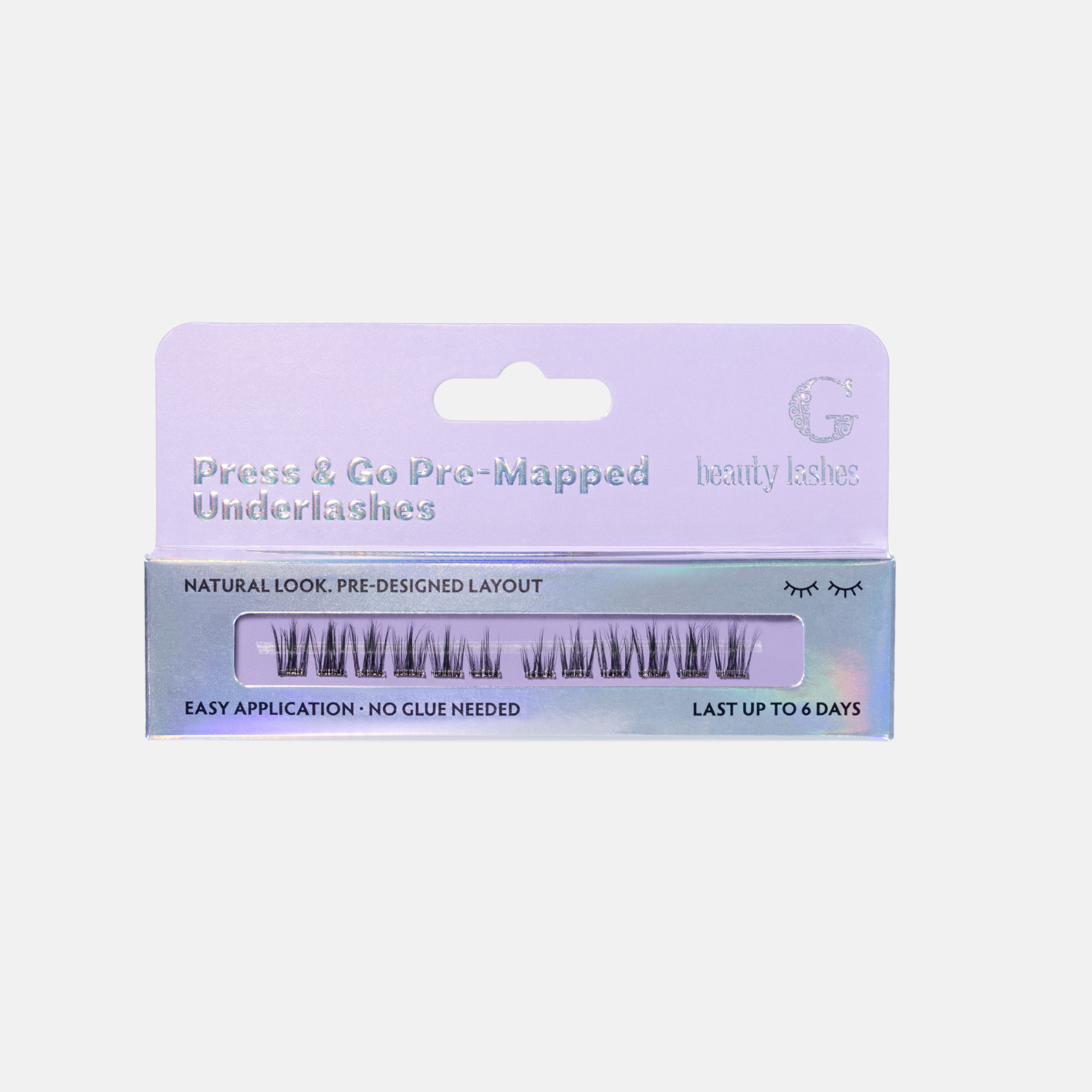 G Beauty Lashes Press & Go Pre-Mapped Underlashes Glow make applying false lashes quick and easy. Each lash cluster in the package is pre-sized to perfectly fit your eyes. The package contains 10 pre-designed clusters, giving you an even and polished result for both eyes without glue or extra adjustments. The lashes are self-adhesive and are applied under your natural lashes, resulting in a natural and light look. They last for up to 3–6 days and are perfect for those who value speed, ease, and a striking result.